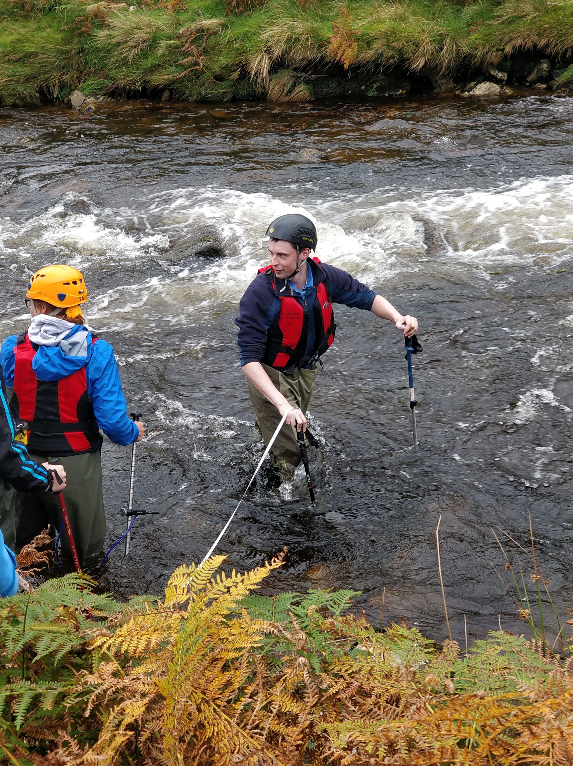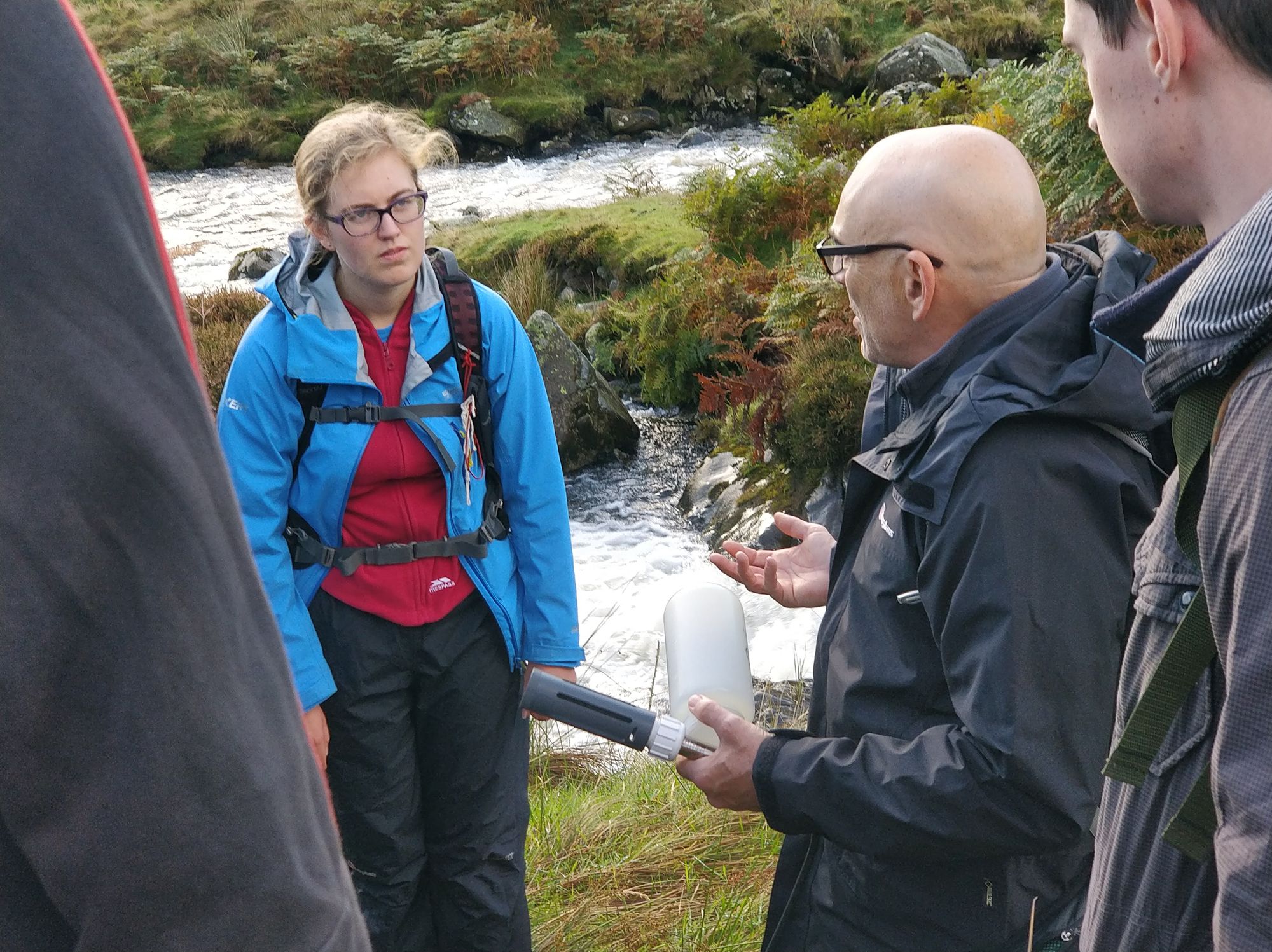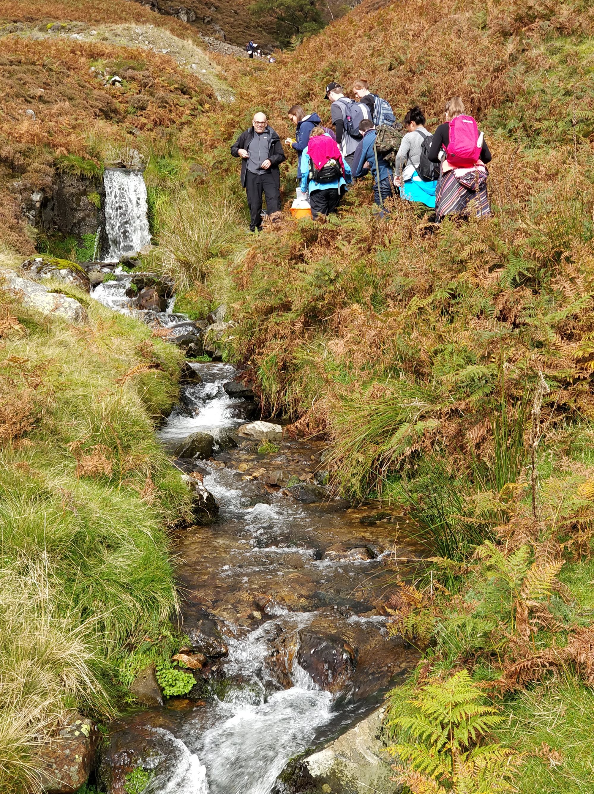 The students were learning methods of streamflow gauging - in this case dilution gauging using a pink dye (which needs permission from the EA to use). They also used direct volumetric methods using buckets and a large bivvy bag! Usually we do streamflow gauging in the Caldew however it was still very high and attempts to carry out this work were very quickly aborted when Ethan was in well over his knees within a couple of feet of the edge!